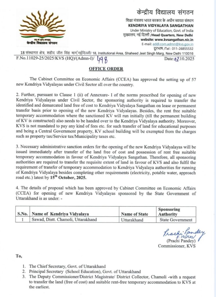 चमोली जिले के स्वाड़ गांव में केंद्रीय विद्यालय खोलने का रास्ता साफ हो गया है। लंबे समय से हो रहे प्रयासों को सफलता मिलते हुए केंद्रीय कैबिनेट की स्वीकृति के बाद अब केंद्रीय विद्यालय संगठन ने भी विद्यालय स्थापना के लिए निर्देश पत्र जारी कर दिया है।